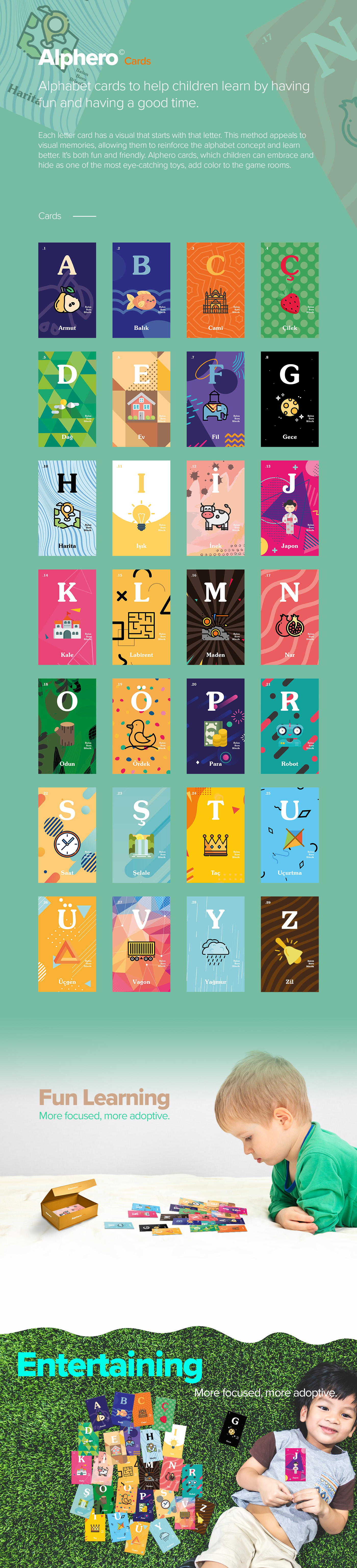 Her harf kartında o harf ile başlayan bir görsel bulunuyor. Bu yöntem görsel hafızalarına hitap ederek alfabe kavramını pekiştirip daha iyi öğrenmelerine olanak tanıyor. Hem çok eğlenceli hem de arkadaş canlısı. Çocukların daha çok sahiplenecekleri ve en göz alıcı oyuncaklarından biri olarak saklayabilecekleri Alphero kartları oyun odalarına rengarenk duygular katıyor.